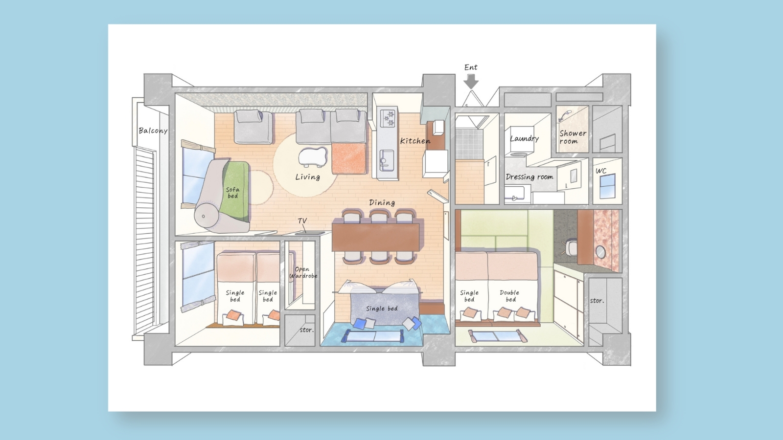 平面間取り図|民泊の家具付き図を魅力的にします 一級建築士による手描きイラスト図面で差別化を